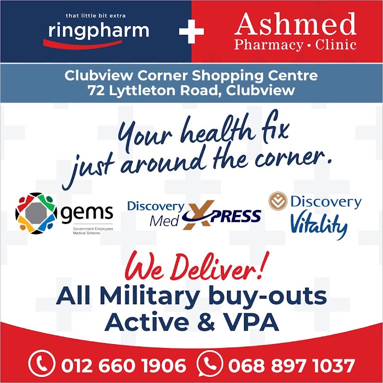 Posted on AlexTrustindex verifies that the original source of the review is Google. Great pharmacy, always have what we need. Great staff, always friendly and helpful. I gladly drive past Dischem and Clicks to visit Ashmed.Posted on Sunette Van SchalkwykTrustindex verifies that the original source of the review is Google. This is my go-to pharmacy. I always get professional and friendly service from Liane. Their pricing is affordable as an added bonus. Keep up the great work!Posted on Celeste van ZylTrustindex verifies that the original source of the review is Google. Very helpful, knowledgeable and go the extra mile!Posted on Faraaz Mahomed (Electrogriffin77)Trustindex verifies that the original source of the review is Google. Great experience would go to them againPosted on Quintin DoyleTrustindex verifies that the original source of the review is Google. Die personeel is altyd vriendelik en bereid om te help. Baie kundig en professioneel. Hierdie apteek is altyd goedkoper as Dischem of Clicks. Ondersteun hulle al jare. Die besoek werd.Posted on Jade HayesTrustindex verifies that the original source of the review is Google. Best pharmacy with staff that treats you like family.. Best prices by far.. Plus they deliver.. What more can you ask for.. Don’t miss out on their crazy Black Friday specials.. Thanks Yusuf and your amazing team ⭐️Posted on Werner PretoriusTrustindex verifies that the original source of the review is Google. Excellent service, staff always friendly and willing to assist to make sure customer needs are met.Posted on RayshazTrustindex verifies that the original source of the review is Google. My entire family and most colleagues from Blue Label Telecoms support this pharmacy because you feel like family. The friendliness, efficiency, knowledge and competency of each and every member of staff as well as the owner makes visiting them feel like a place where you belong. I hear them call clients that walk in by name, this goes to show that they value their clientele as well as take pride in what they do. Dischem, Clicks and other pharmacies could learn from this establishment. Keep it up guys.Posted on Farzana AbooTrustindex verifies that the original source of the review is Google. Been going to this pharmacy since they opened. Always have stock of prescrition and self medication and the best/cheapest prices always. Cheaper than clicks and dischem. Pharmacist is really helpful aswell. Delivery services have just been added on aswell